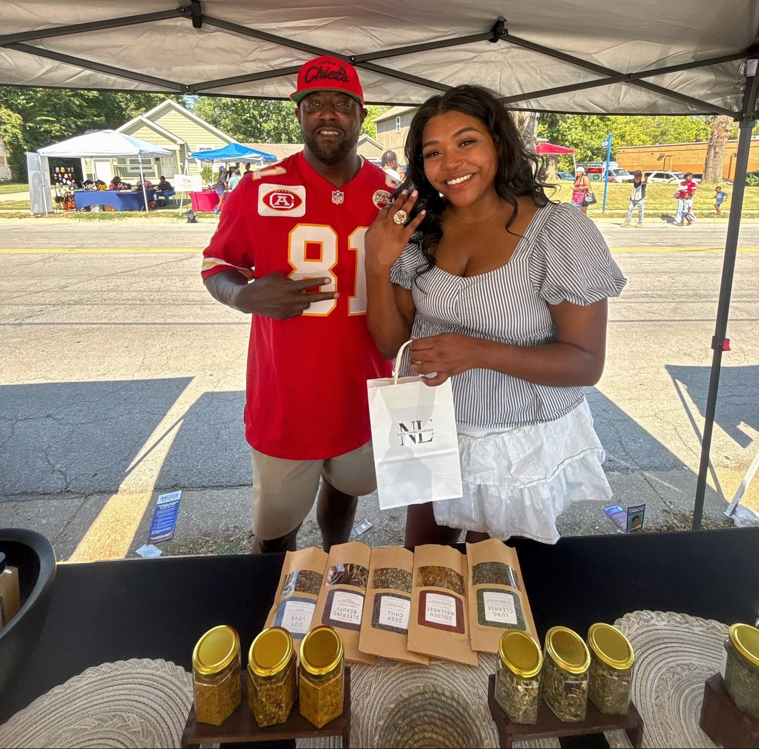 Two people standing behind a table with loose leaf tea jars and a statue, with a parking lot and tents in the background.